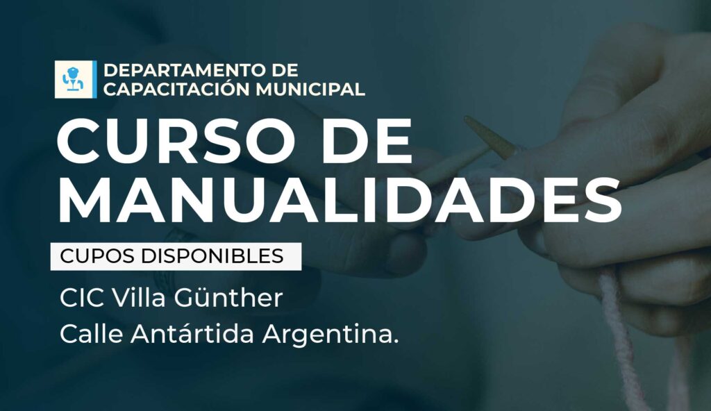 Se encuentran disponibles cupos para el curso de manualidades, perteneciente al Departamento de Capacitación Municipal, el cual se realiza todos los jueves de 14hs a 17hs en el CIC de Villa Günther ubicado en calle Antártida Argentina. Quienes deseen inscribirse y obtener más información pueden hacerlo comunicándose al Tel. 407007.