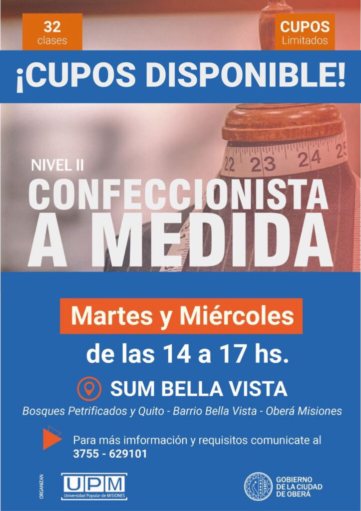 El Gobierno de la Ciudad de Oberá, en conjunto con la Universidad Popular de Misiones, abre la inscripción al curso de formación profesional en Confeccionista a Medida Nivel II, destinado a personas que cuenten con conocimientos previos en confección y moldearía. El curso se dictará los días y horarios: martes y miércoles, de 14 a […]