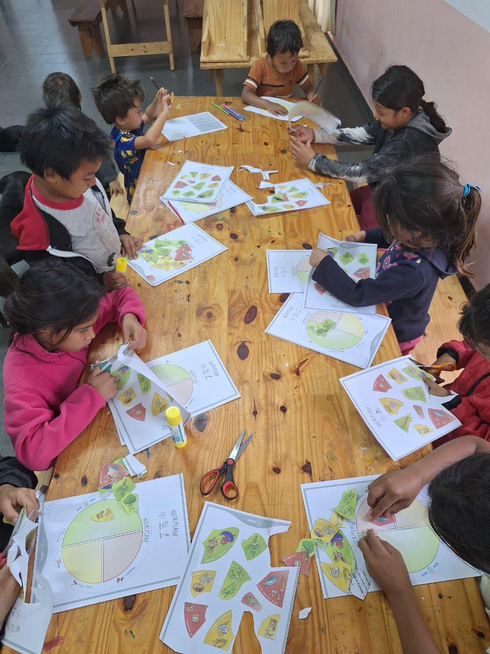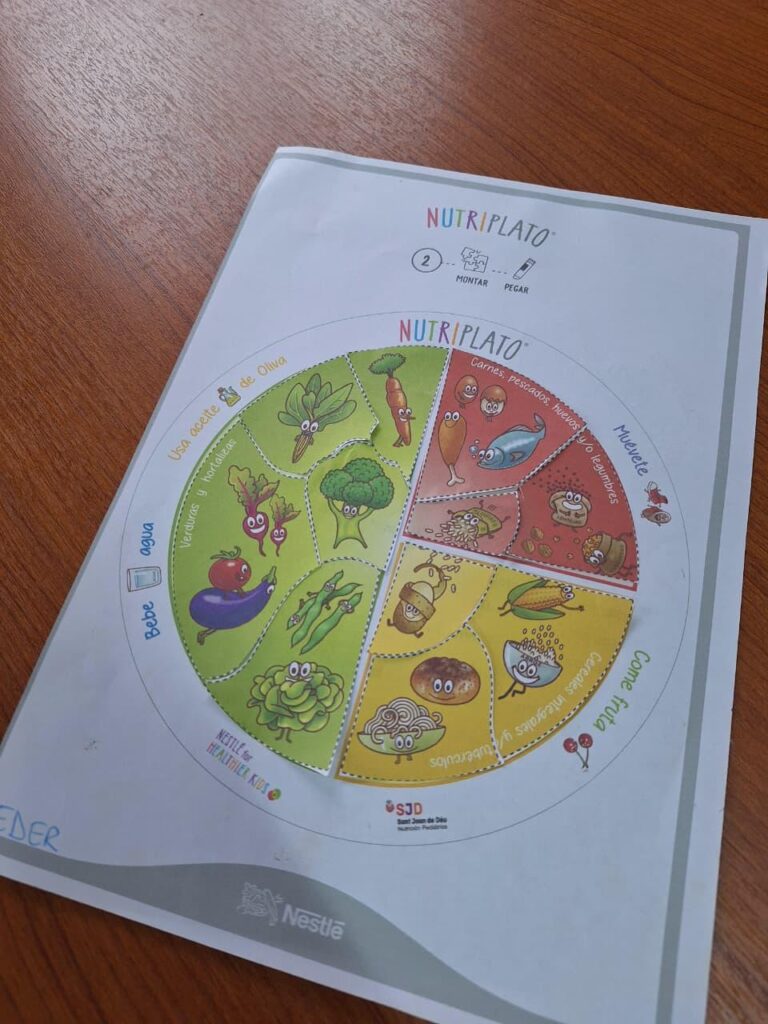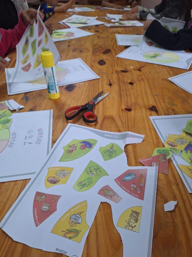 La propuesta consistió en la construcción del plato saludable en su versión infantil. A través de un rompecabezas didáctico, los participantes recortaron y pegaron diferentes alimentos, ubicándolos en el lugar correspondiente dentro del plato.