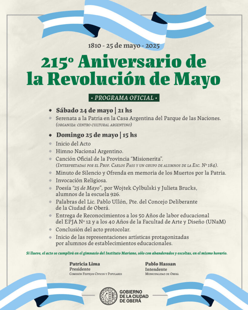 Las actividades comenzarán el sábado 24 con la Serenata a la Patria, mientras que el domingo se desarrollará el Acto Patrio en el Centro Cívico Manuel Belgrano desde las 15 horas. La semana de mayo se palpita en la comunidad obereña y la Comisión Festejos Cívicos y Populares, junto al Gobierno de la Ciudad de Oberá, organizan las actividades para la celebración del 215° aniversario de la revolución. El sábado 24 en el Pabellón Argentino del Parque de las Naciones, se realizará la tradicional serenata a la patria, desde las 21 horas y a la media noche se cantará el Himno Nacional Argentino. El domingo 25, desde las 15 horas se realizará el acto patriótico, dónde Wojtek Cylbulski y Julieta Brucks, alumnas de la escuela N° 926 interpretarán la poesía “25 de Mayo”. El presidente del Concejo Deliberante Pablo Ullón, será el responsable de las palabras alusivas. En el mismo acto se entregarán reconocimientos a los 50 años de labor educacional del EPJA N° 12 y a los 40 años de la Facultad de Arte y Diseño. Para finalizar la actividad habrá representaciones artísticas protagonizadas por alumnos de establecimientos educacionales. Cabe destacar que, en caso de lluvias, el acto se cumplirá en el gimnasio del Instituto Mariano con solo los abanderados y escoltas de los establecimientos educaciones. |