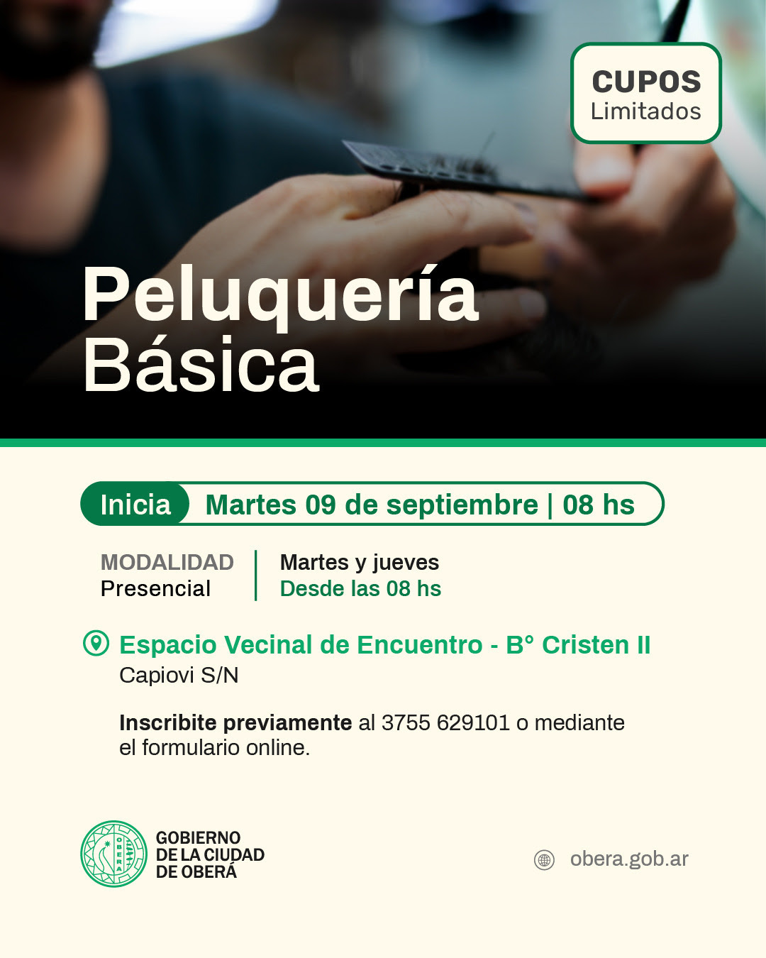 El Taller de Peluquería Básica se dictará en el barrio Cristen II, destinado a personas interesadas en adquirir conocimientos fundamentales sobre el oficio de la peluquería y el cuidado capilar.