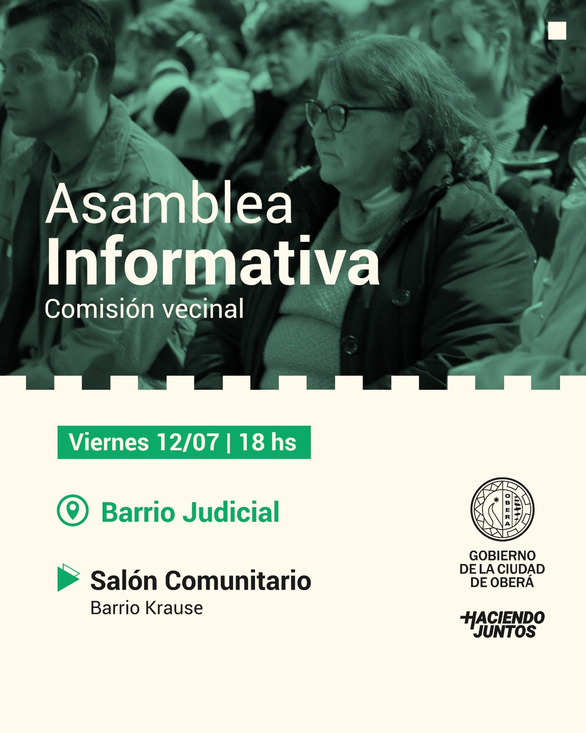 Desde el Gobierno de la Ciudad de Oberá, se convoca a los vecinos del barrio Judicial a la realización de la asamblea informativa, vinculada a todo lo que involucra al proceso de elecciones para la conformación de autoridades de las Comisiones Vecinales.