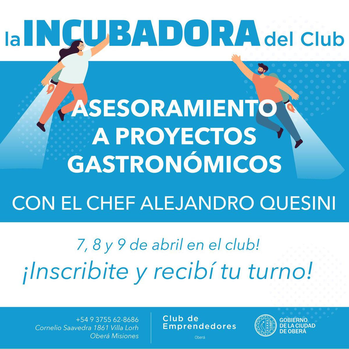 Serán tres días de capacitación que brindará el chef Alejandro Quesini para personas que necesiten asesoramientos a proyectos gastronómicos, se desarrollará en el Club de Emprendedores.