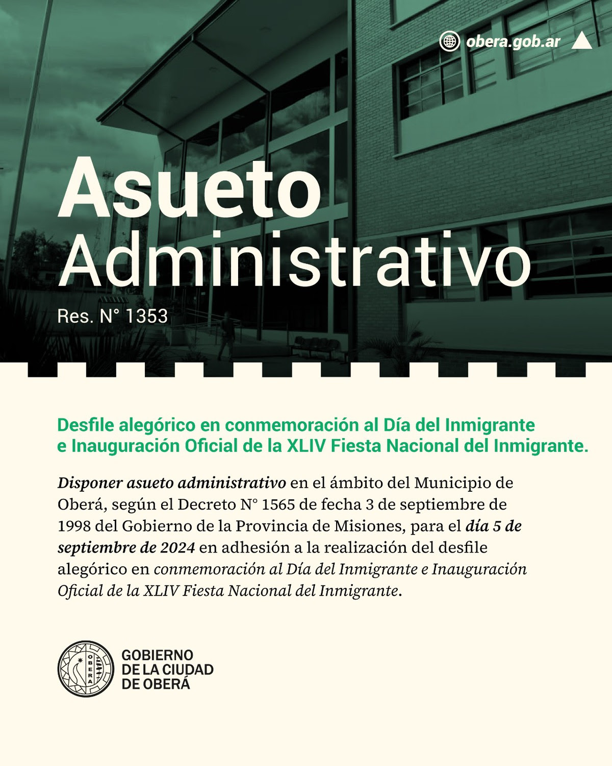 Por resolución Nº 1353, desde el Gobierno de la Ciudad de Oberá dispuso del asueto administrativo en el ámbito del Municipio de Oberá, según decreto Nº 1556 de la fecha 3 de septiembre de 1998 del Gobierno de la Provincia de Misiones, para el día 5 de septiembre de 2.024.