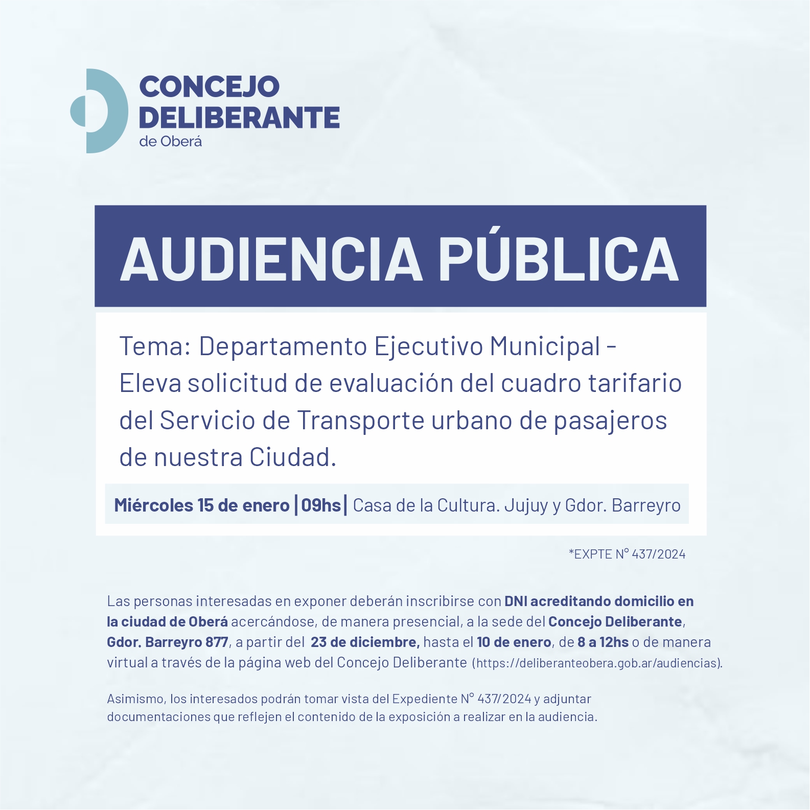 Autoridad Convocante: El Concejo Deliberante de Oberá mediante Resolución Nº 214/2024.- ha dispuesto convocar a Audiencia Pública.