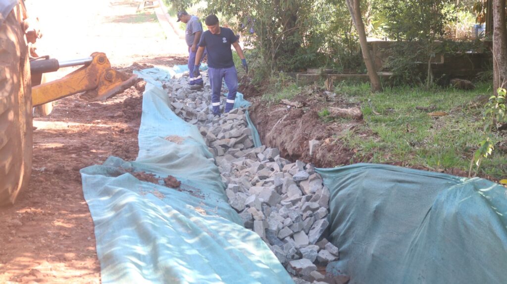Frente a este escenario, se decidió aplicar una solución técnica específica antes de avanzar con la construcción del cordón cuneta. Se trata de un sistema de drenaje, que consiste en una zanja con pendiente que permite que el agua fluya desde el punto más alto al más bajo. En su interior se colocan piedras especiales que facilitan el paso del agua, junto con una malla geotextil que actúa como filtro, evitando que la tierra tape el drenaje. Luego, se completa con suelo apto para garantizar estabilidad.