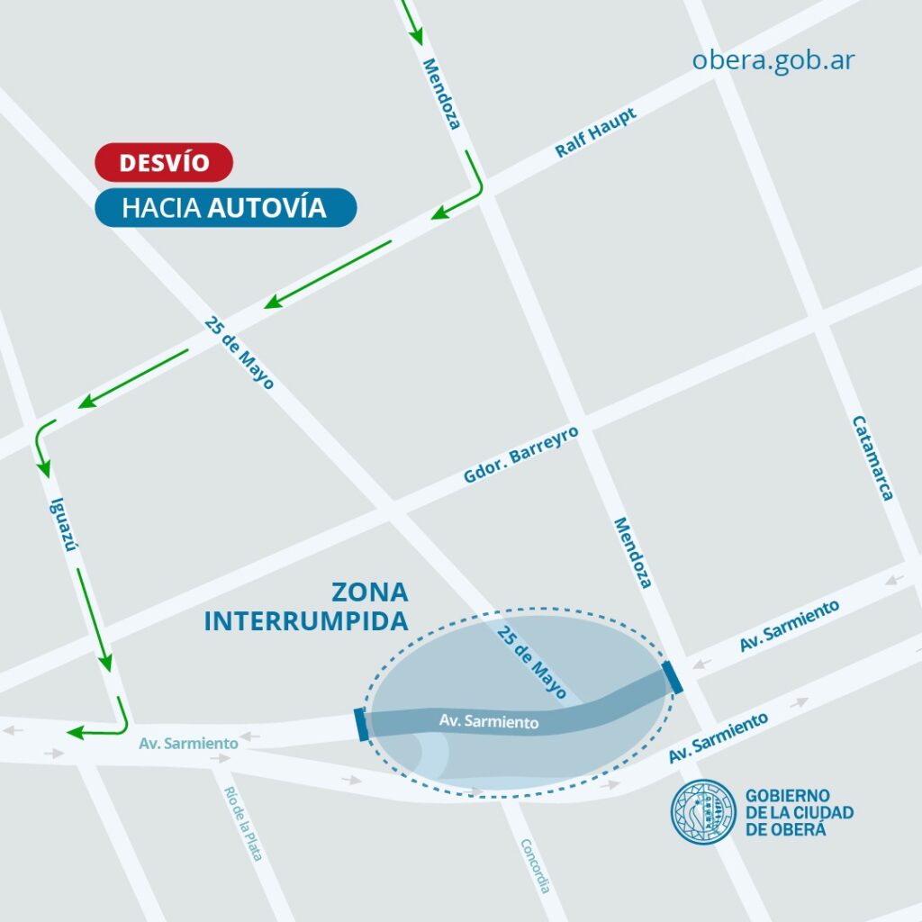 De 18hs a 20hs, el tránsito será de media calzada por avenida Sarmiento. Desde las 20hs hasta el final de los trabajos, la interrupción será completa por lo que se deberá desviar por calle Catamarca hasta Ralf Haupt, y de allí hasta calle Iguazú para retornar a la autovía.