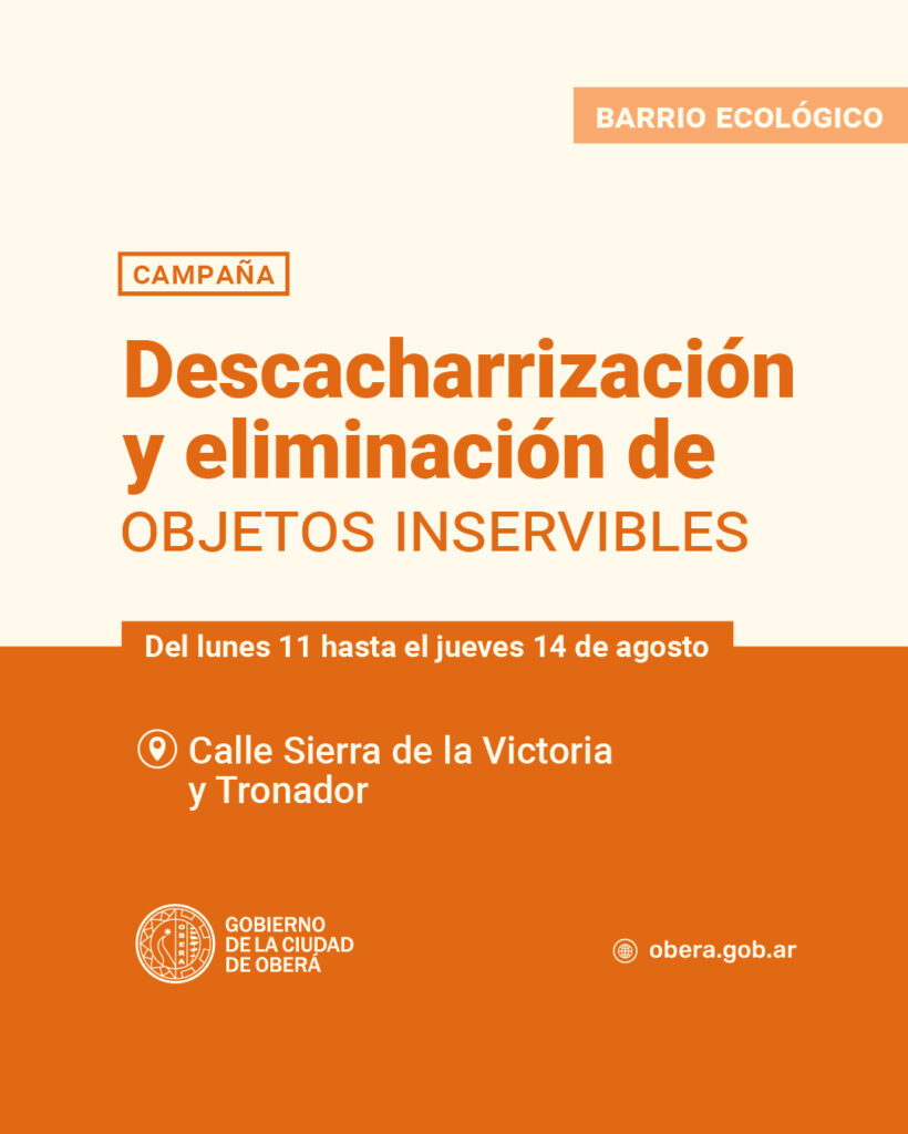 Esta semana del 11 al 14 de agosto se realizarán tareas de recolección de inservibles y chatarras en el barrio Ecológico con personal municipal y promotores de salud que recorrerán los domicilios con tareas de concientización sobre el aedes eagyptis transmisor de enfermedades como el dengue y otras.
