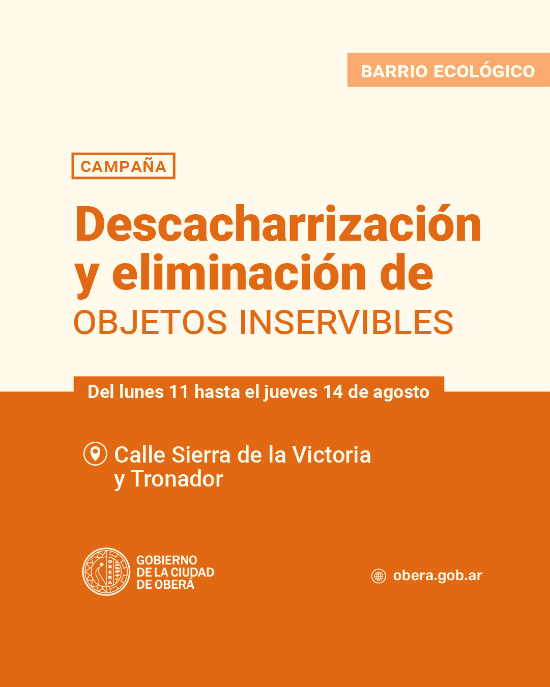 Esta semana del 11 al 14 de agosto se realizarán tareas de recolección de inservibles y chatarras en el barrio Ecológico con personal municipal y promotores de salud que recorrerán los domicilios con tareas de concientización sobre el aedes eagyptis transmisor de enfermedades como el dengue y otras.