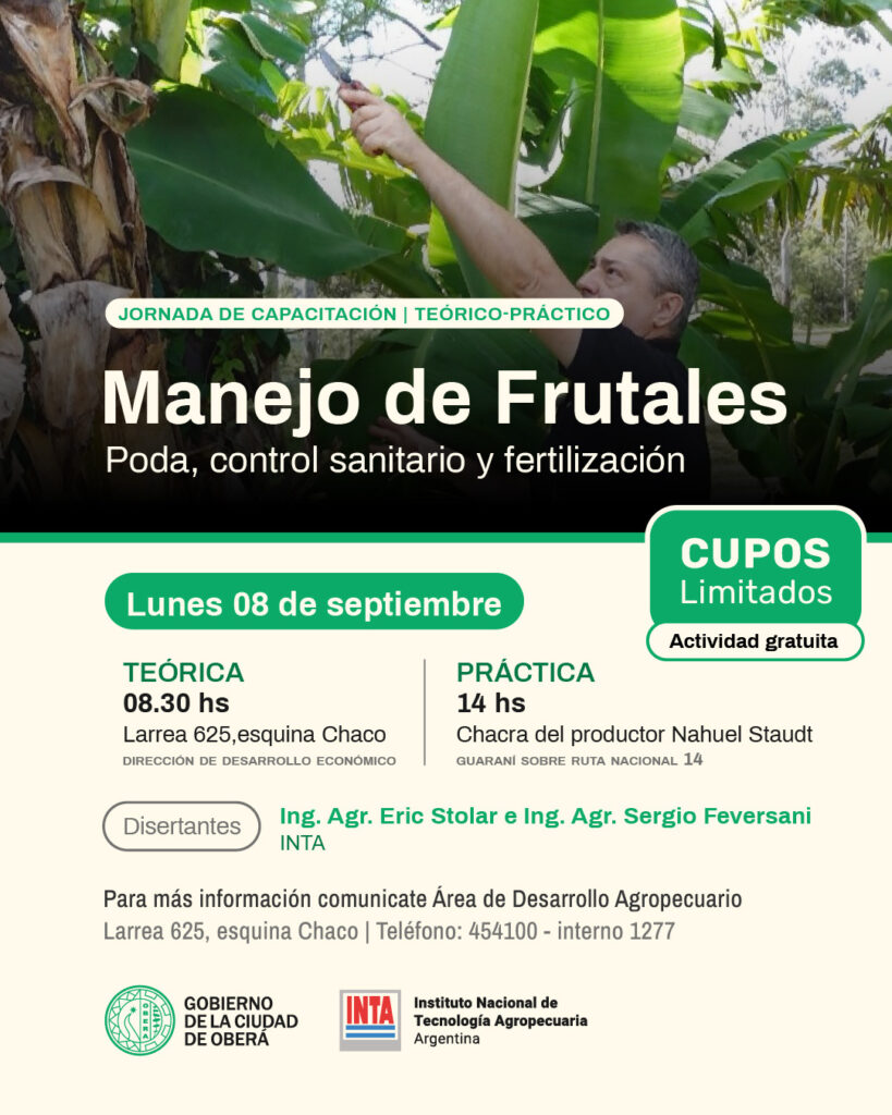 El Gobierno de la Ciudad de Oberá invita al público en general a participar de una capacitación integral en manejo de frutales, pensada para quienes desean mejorar el rendimiento de su producción, incorporar técnicas de manejo sostenible y aprender métodos de prevención de enfermedades que afectan a los cultivos.