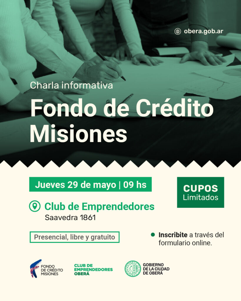 El Gobierno de la ciudad de Oberá, a través del Departamento de Capacitación y el Club de Emprendedores, brindarán información sobre los distintos créditos, los requisitos para acceder al financiamiento.
