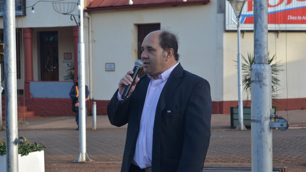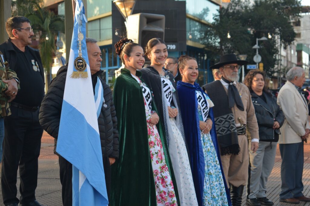 En el Centro Cívico Manuel Belgrano, se desarrolló el acto por el día de la Bandera de Oberá, con participación de diferentes sectores de la comunidad y palabras del docente Fabián Doretto.