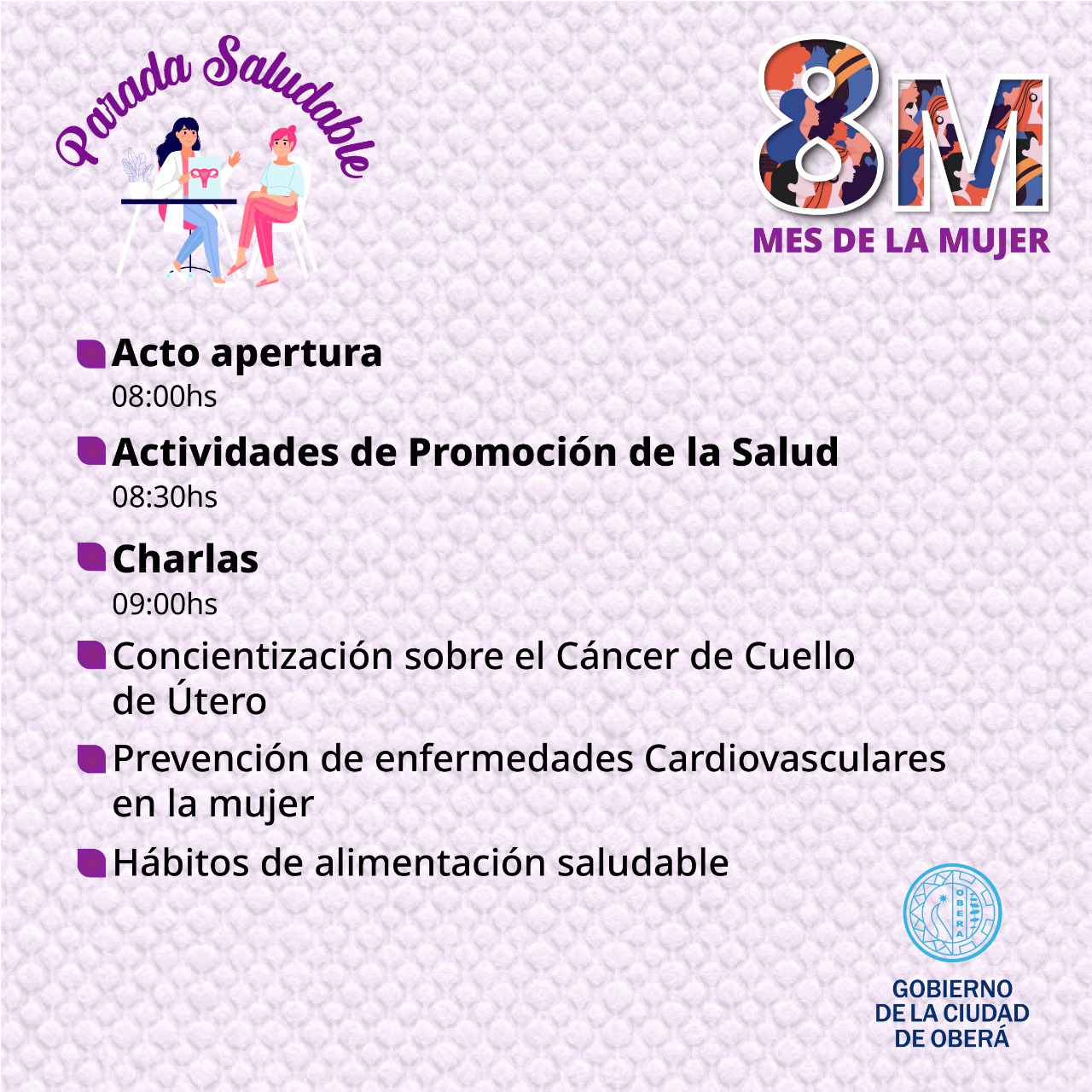 En la misma mañana se darán charlas acerca de la concientización de cáncer de cuello de útero, prevención de enfermedades cardiovasculares en la mujer y hábitos de alimentación saludable.