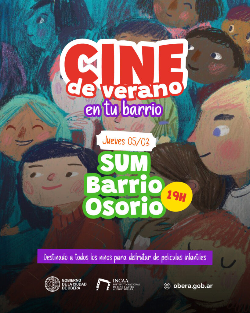 El programa “Cine de Verano en tu Barrio”, es una actividad recreativa y cultural, que se desarrolla de manera conjunta entre el Departamento de Juventud, las Comisiones Vecinales y el Cine Teatro Oberá – Espacio INCAA, y contempla la realización de funciones gratuitas de cine infantil al aire libre.