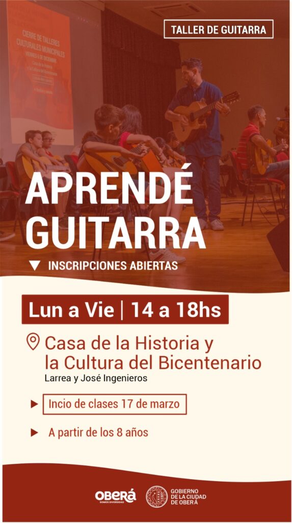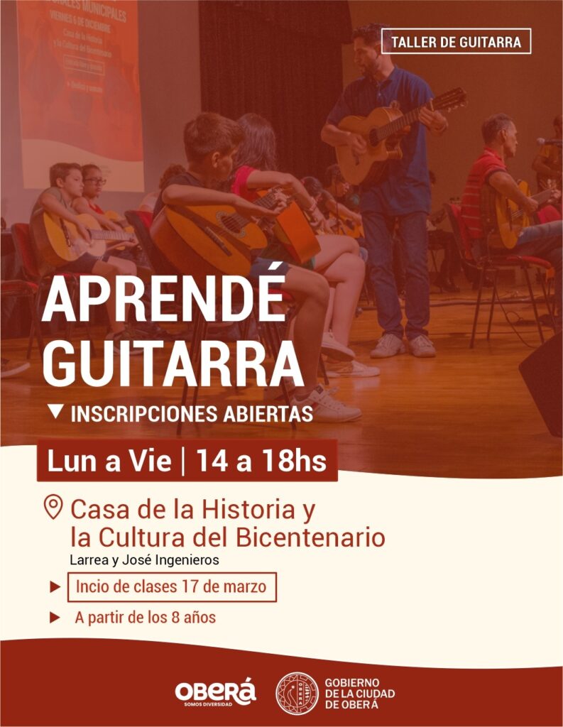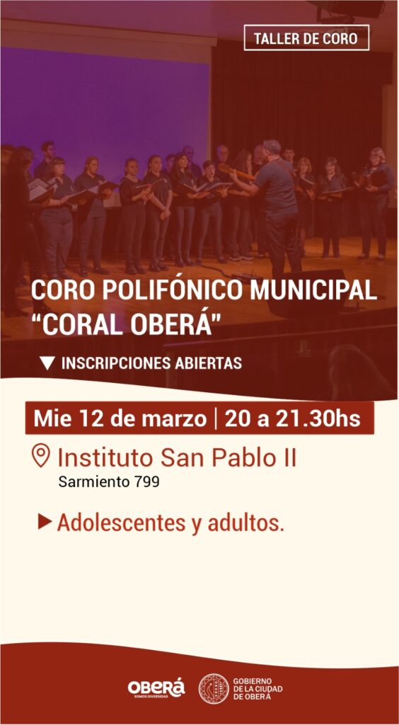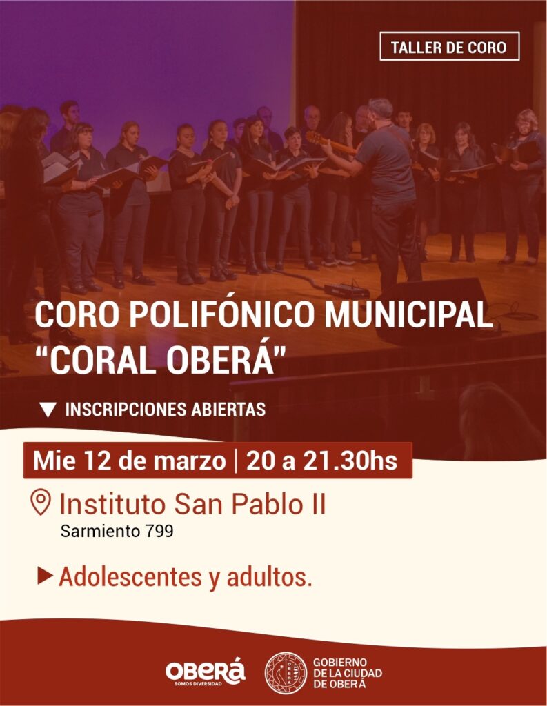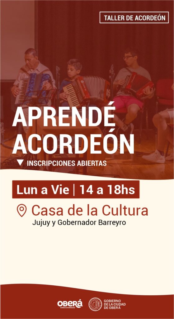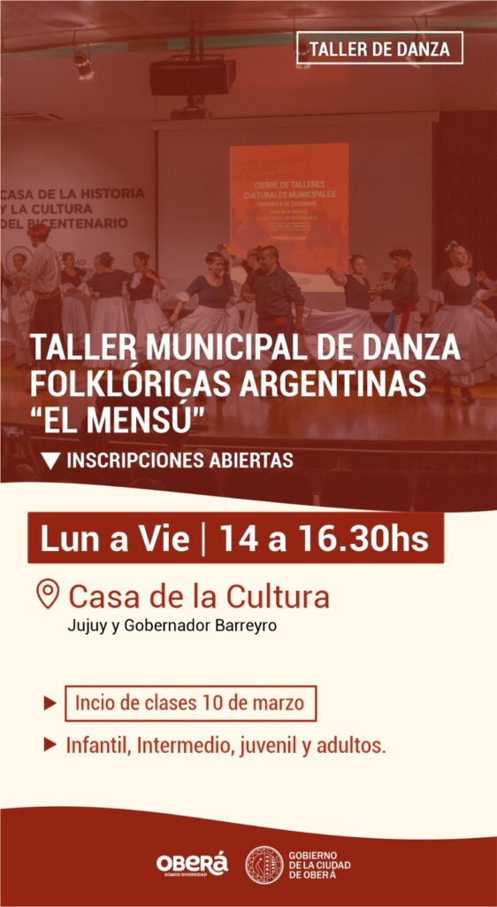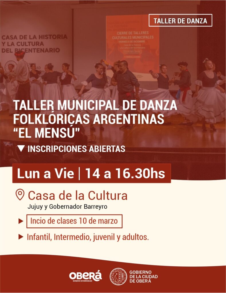 El Gobierno de la Ciudad de Oberá informa que ya se encuentran abiertas las inscripciones para los Talleres Culturales 2025. Los interesados podrán inscribirse en actividades como el Coro Polifónico Municipal «Coral Oberá», el Taller de Teatro Grupo Expresiones, Talleres de Acordeón, Taller de Guitarra, el Taller Municipal de Danzas Folklóricas Argentinas y el taller «El Mensú».