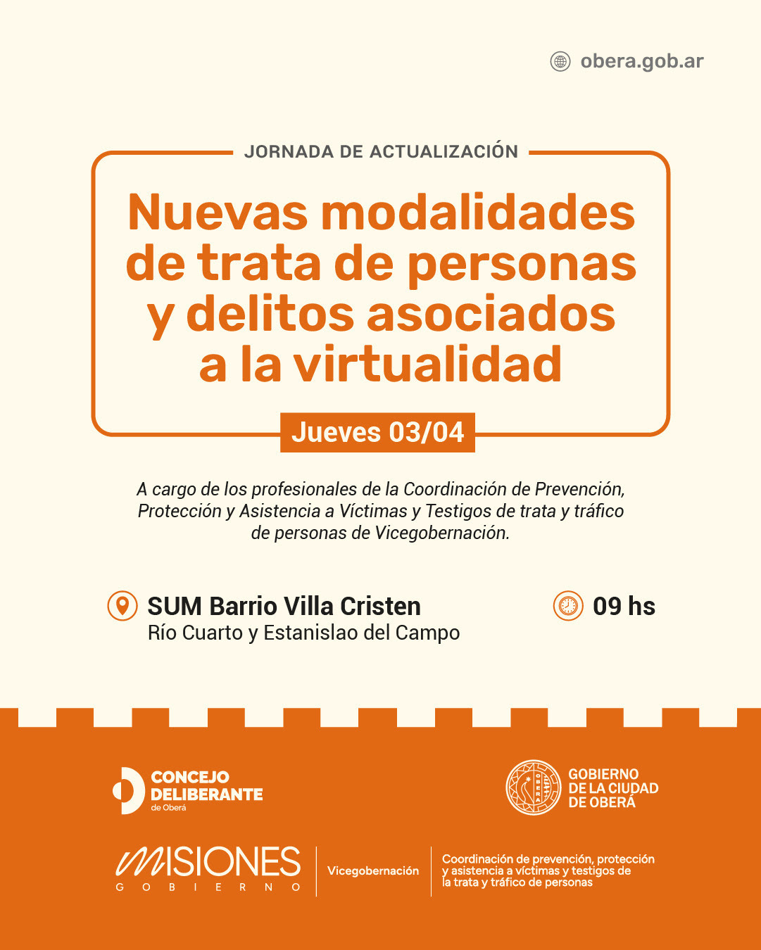 Esta capacitación para instituciones de nuestra ciudad busca actualizar los contenidos asociados a la trata de personas y las nuevas modalidades de captación a través de las redes sociales y medios digitales. Se desarrollará el jueves 3 de abril en el SUM de villa Cristen a las 9 horas, organizado por la Vicegobernación de Misiones, acompaña el Concejo Deliberante y el Gobierno de la Ciudad de Oberá. Los profesionales de la coordinación de prevención, protección y asistencia a víctimas y testigos de trata y tráfico de personas dependiente de la vice gobernación de la provincia de misiones serán los encargados de capacitar a los profesionales de nuestra ciudad en lo que se refiere a esta temática tan sensible. Hoy la trata de personas tiene diferentes modalidades por lo que resulta fundamental adquirir herramientas para entender el panorama actual y extremar las medidas de cuidado y protección de nuestra sociedad. |