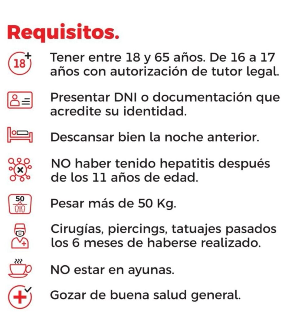 Requisitos para donar: tener entre 18 y 65 años. De 16 a 17 años con autorización de tutor legal. Presentar DNI o documentación que acredite la identidad. Descansar bien la noche anterior. No haber tenido hepatitis después de los 11 años de edad. Pesar más de 50 kg. Cirugías, piercings, tatuajes pasados los 6 meses de haberse realizado. No estar en ayunas. Gozar de buena salud en general.