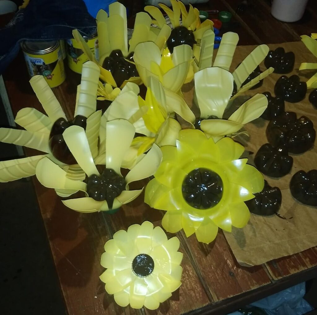 “Fui cortando botellas para formar las flores y hojas luego las  pinté. Una coneja la hice de telas recicladas y el relleno también todo retazos de telas y botellas. La otra coneja es de madera la cual nos  otorgó el municipio y también utilicé retazos de telas. El huevo grande  fue hecho con rejillas de ventilador y fondos de botellas que luego también las pinte. Forre una caja de plástico con retazos de tela ecológica y con bolsitas di forma a los dos huevos grandes, los chicos son cáscaras de huevos forradas con retazos de tela”, contó Nilda.
