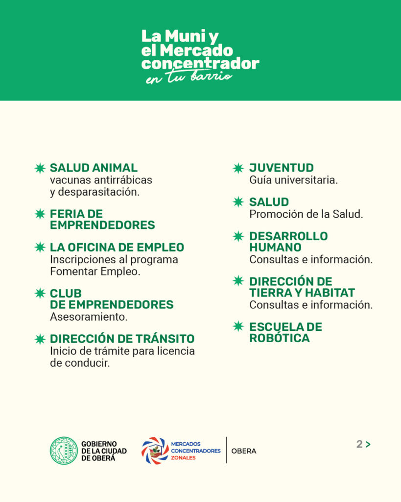 Mientras que desde la municipalidad, estarán con atención en salud animal,  con vacunas antirrábicas y desparasitación, la Oficina de Empleo realizará inscripciones al programa Fomentar Empleo, el área de la Juventud tendrá guía universitaria, el Departamento de Salud trabajará en la promoción de la salud, la Dirección de Desarrollo Humano estará para consultas e información, la Dirección de Tránsito realizarán la guía para el inicio de trámite para la licencia de conducir, mientras que el Club de Emprendedores ofrecerá asesoramiento y se sumarán la feria de emprendedores.
