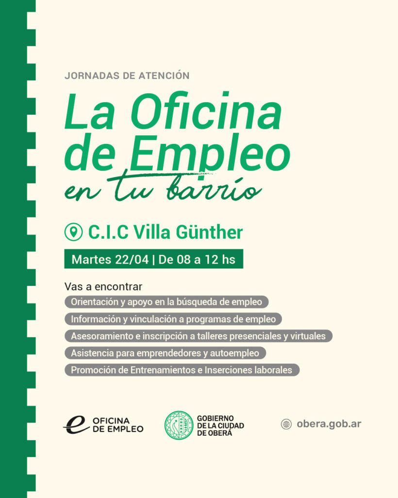 Con el objetivo de descentralizar la gestión del Gobierno Municipal y brindar respuestas rápidas y efectivas a la comunidad, la Oficina de Empleo llevará a cabo jornadas de atención en los Centros Integradores Comunitarios de los barrios Günther y Schuster.