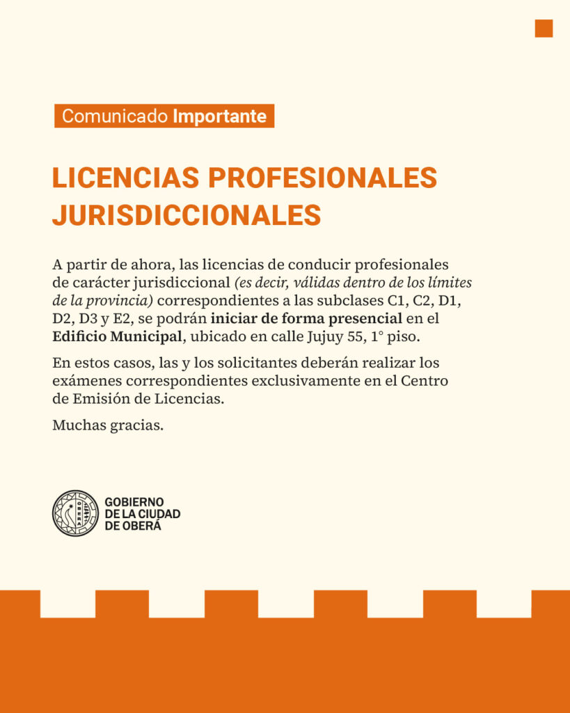 El Gobierno de la Ciudad de Oberá informa a los conductores que, a partir de ahora, las licencias profesionales de carácter jurisdiccional, se podrán iniciar de forma presencial en el edificio municipal en calle Jujuy 55, primer piso.