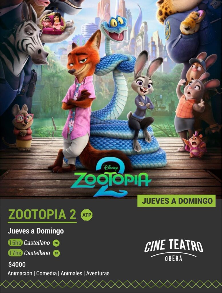 Entre ellas se destaca Zootopia, la exitosa comedia animada que vuelve a la pantalla grande con una nueva aventura donde Judy y Nick deberán enfrentar el caos generado por un misterioso reptil recién llegado a la ciudad. Se proyectará en funciones 2D a las 15:00 hs y 3D a las 17:00 hs, en castellano, con entradas a $4000.