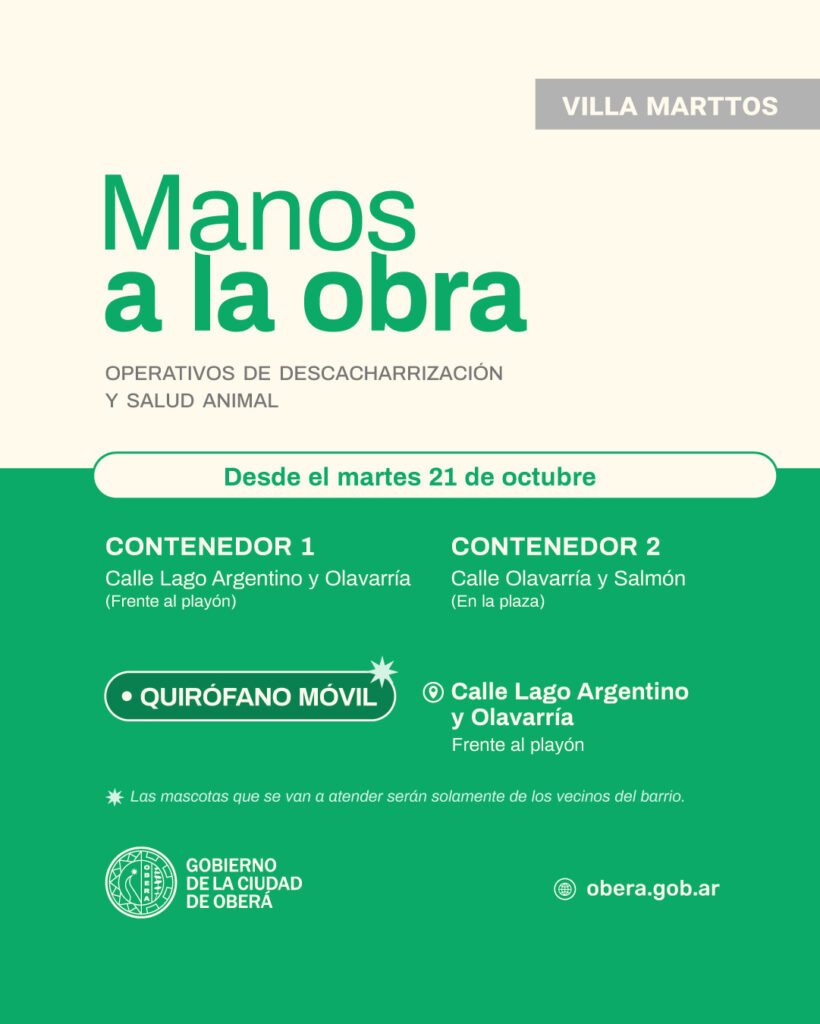 Con esta intervención, el Gobierno de la Ciudad de Oberá busca continuar promoviendo la limpieza urbana y el cuidado de la salud animal, trabajando junto a los vecinos en la construcción de una ciudad más saludable.