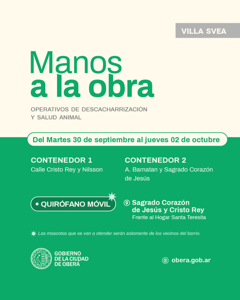 Noticias Todas las noticias Comercio Culto Deportes Desarrollo Humano y Acción Social Gestión Juventud Intendencia Inmueble Tránsito y Seguridad Vial Niñez y Familia Obras e Infraestructura Urbana Zoonosis y Salud Animal Salud y Prevención de Adicciones Servicios Públicos y Ambiental Turismo Vinculación y Desarrollo Económico Desarrollo Humano y Acción Social Operativo “Manos a la Obra” en Villa Svea: descacharrización y salud animal 29 de septiembre, 2025 Seguir Leyendo Anterior Siguiente