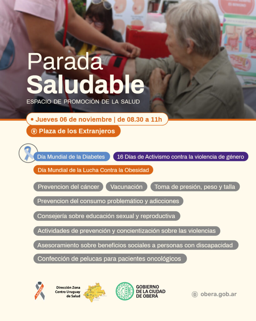 Este jueves 6 de noviembre, de 8:30 a 11 horas, se llevará a cabo una nueva edición de la Parada Saludable, un espacio de promoción de la salud impulsado por la Dirección de Zona Centro Uruguay de Salud junto al Gobierno de la Ciudad de Oberá. La jornada se desarrollará en la Plaza de los Extranjeros.