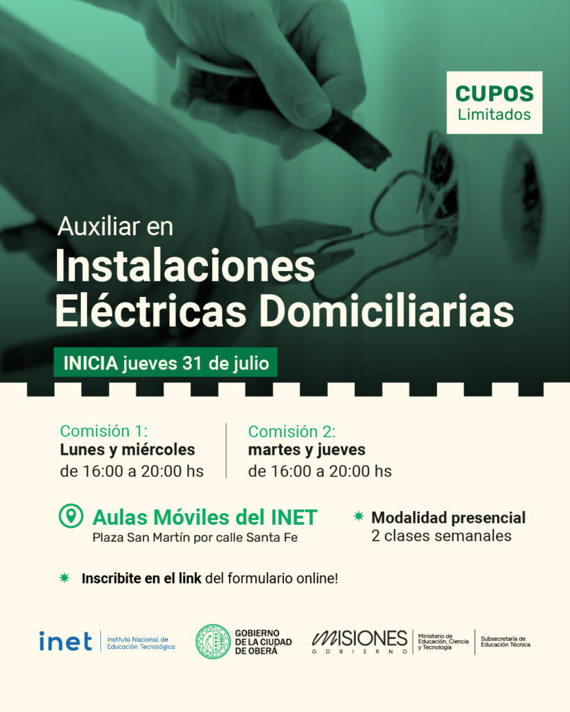 A partir del jueves 31 de julio, el Gobierno de la Ciudad de Oberá da inicio a un nuevo ciclo de capacitaciones gratuitas en oficios, en articulación con la Subsecretaría de Educación Técnica Profesional de la Provincia y el INET.