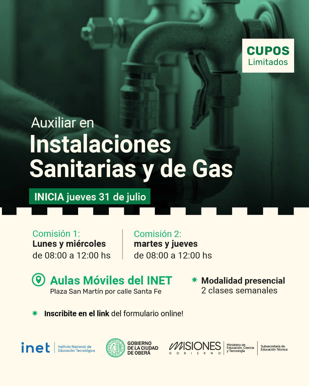 A partir del jueves 31 de julio, el Gobierno de la Ciudad de Oberá da inicio a un nuevo ciclo de capacitaciones gratuitas en oficios, en articulación con la Subsecretaría de Educación Técnica Profesional de la Provincia y el INET.