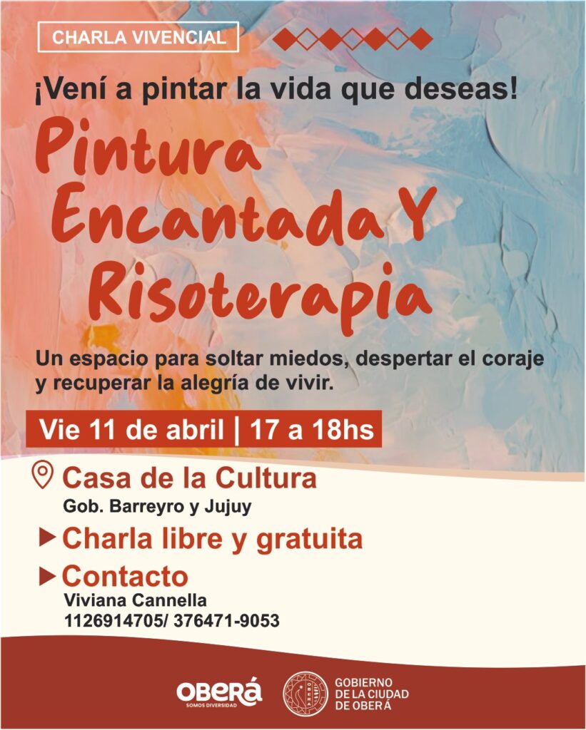 El vienes 11 en el salón auditorio de la Casa de la Cultura, se desarrollará una charla vivencial sobre “Pintura Encantada y Risoterapia” de 17 a 18 horas.