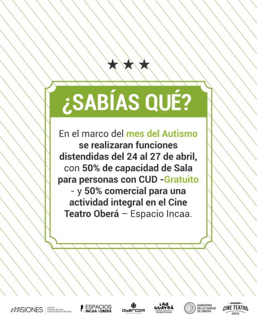 Funciones Distendidas con 50% de capacidad de Sala para personas con CUD – Gratuito – y 50% comercial para una actividad integral en el Cine Teatro Oberá – Espacio Incaa.