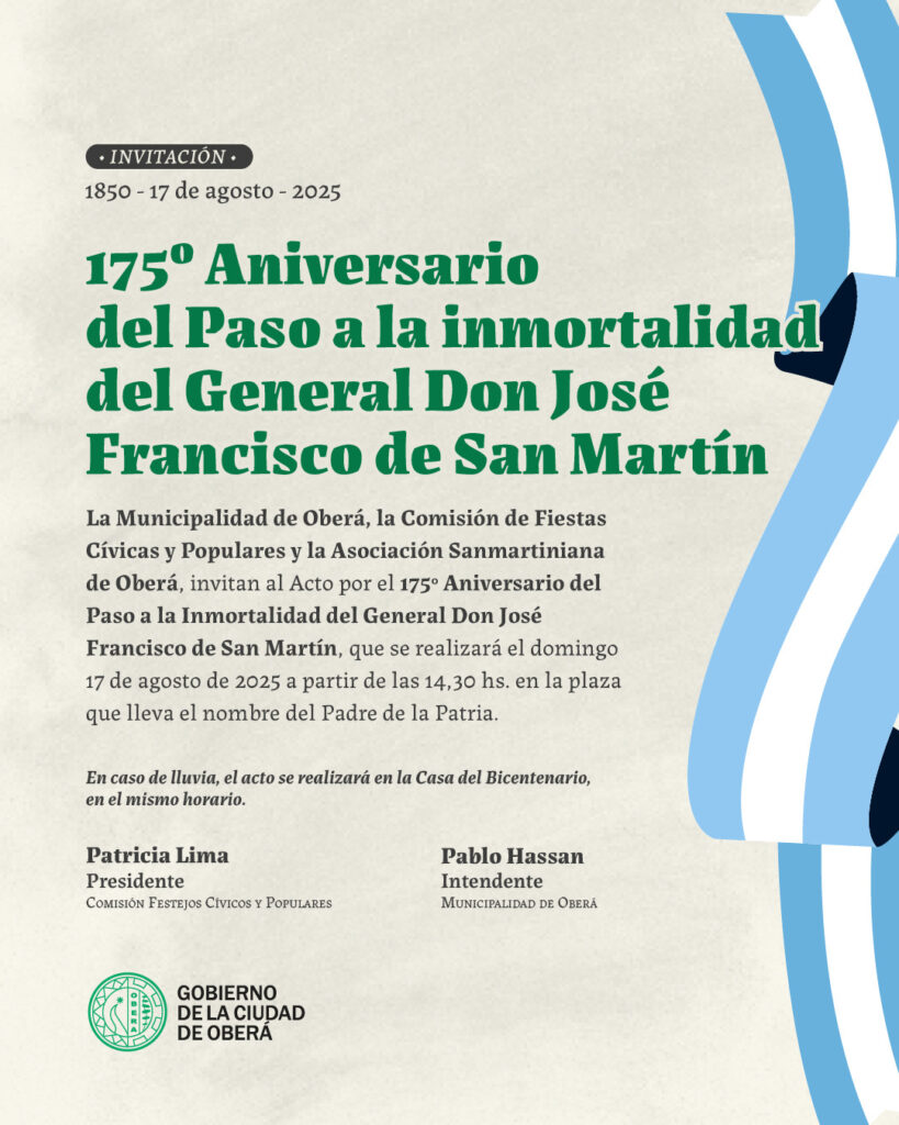 El Gobierno de la Ciudad de Oberá, junto a la Comisión de Fiestas Cívicas y Populares y la Asociación Sanmartiniana de Oberá, invita a toda la comunidad a participar del acto por el 175º Aniversario del Paso a la Inmortalidad del General Don José Francisco de San Martín, que se llevará a cabo el domingo 17 de agosto de 2025, desde las 14:30 horas, en la plaza que lleva el nombre del Padre de la Patria.