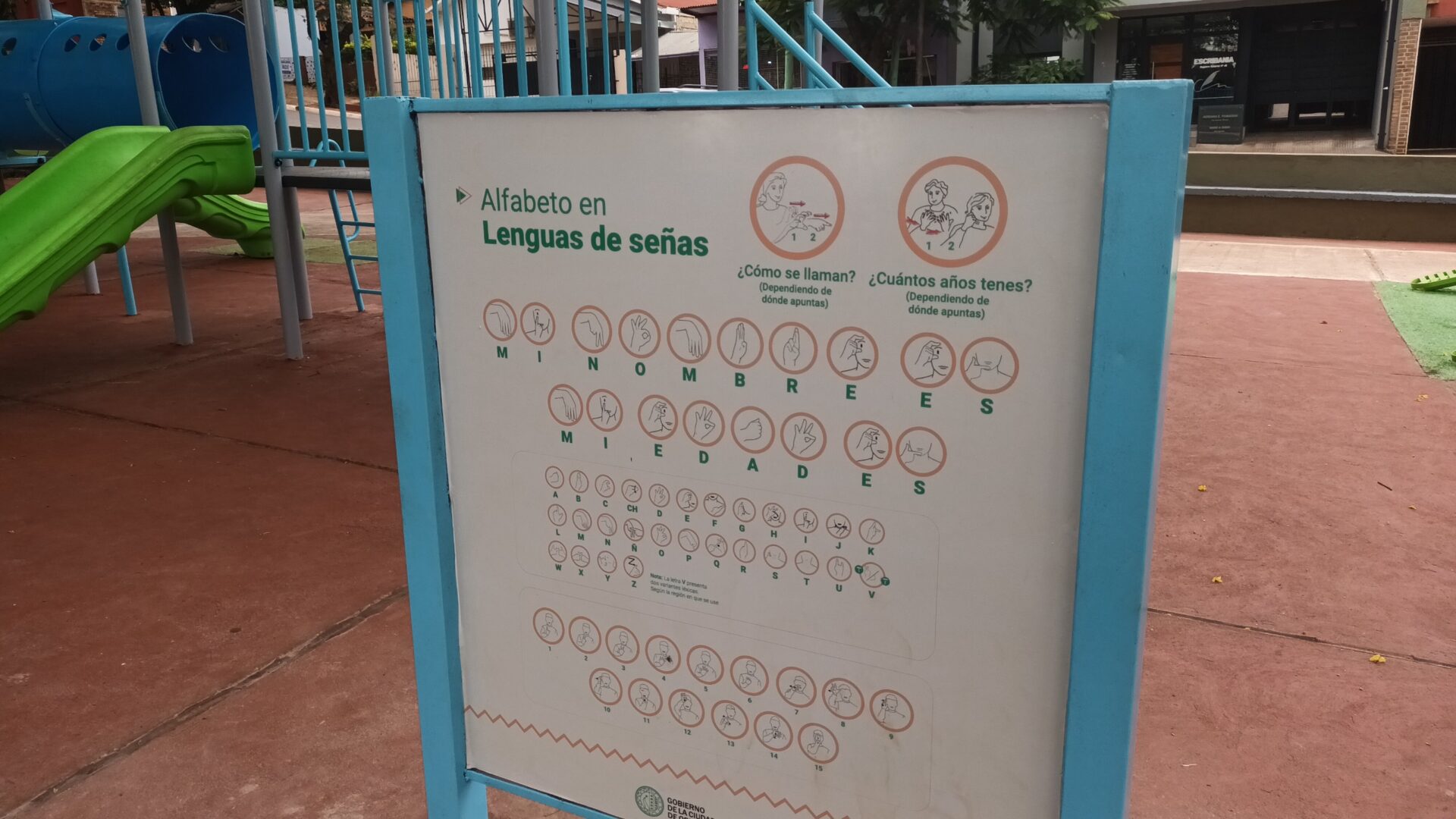 Estos carteles están diseñados especialmente para niños con discapacidad, incorporando elementos accesibles como el alfabeto en lengua de señas, con el objetivo de facilitar la comunicación y la participación de todos los niños en los espacios públicos.