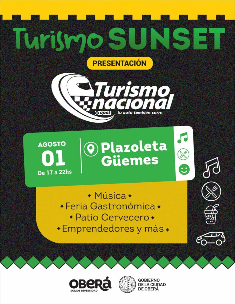 La Dirección de Turismo, Recreación y Cultura del Gobierno de la Ciudad de Oberá se prepara para vibrar con una propuesta imperdible: el «Turismo Sunset: Presentación del Turismo Nacional». Este evento, que marca la bienvenida de un fin de semana a puro rugir de los motores del Turismo Nacional en el circuito local, se llevará a cabo este viernes 1 de agosto, de 17 a 22 horas, en nuestra emblemática Plazoleta Güemes.