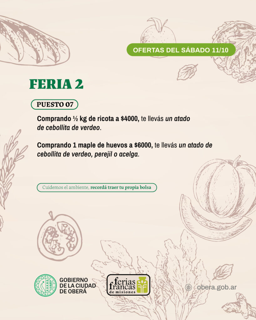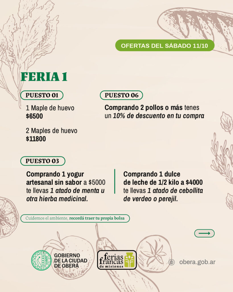 Este sábado 11 de octubre Oberá en las Ferias Francas, vuelven las ofertas a partir de las 6 de la mañana en las dos sedes, uno en plazoleta Uruguay (Av. Sarmiento) y la sede dos en plaza Malvinas (Av. Misiones)
