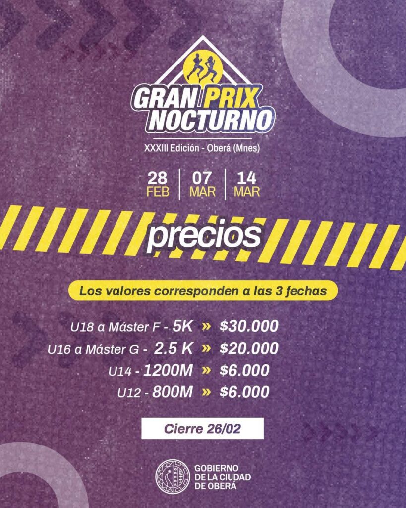 La ciudad de Oberá se prepara para recibir la XXXIII edición del Gran Prix Nocturno, una de las pruebas atléticas más convocantes y esperadas del calendario deportivo local. La competencia se desarrollará en tres fechas: 28 de febrero, 7 y 14 de marzo, convocando a atletas de distintas categorías.