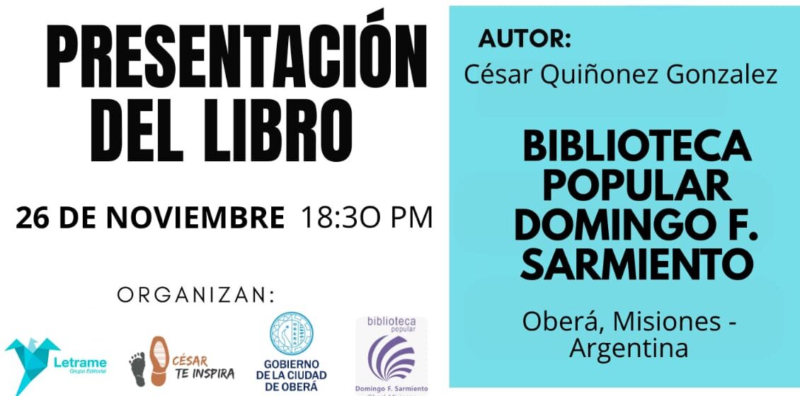 El próximo 26 de noviembre, a las 18:30, se realizará la presentación del libro “El niño que cambió su destino”, obra del autor César Quiñónez Gonzalez, en la Biblioteca Popular Domingo F. Sarmiento de la ciudad de Oberá, Misiones.