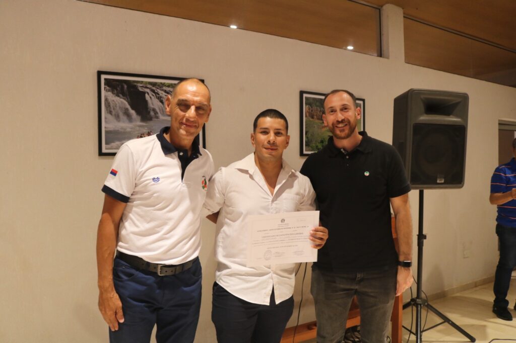 Ante los nuevos guardavidas, resaltó la importancia de la escuela en Oberá, “esta escuela brinda oportunidades porque es una fuente de trabajo, los chicos hoy salen con un trabajo asegurado porque todos los clubes con espejos de agua, todos los balnearios necesitan guardavidas certificados”.