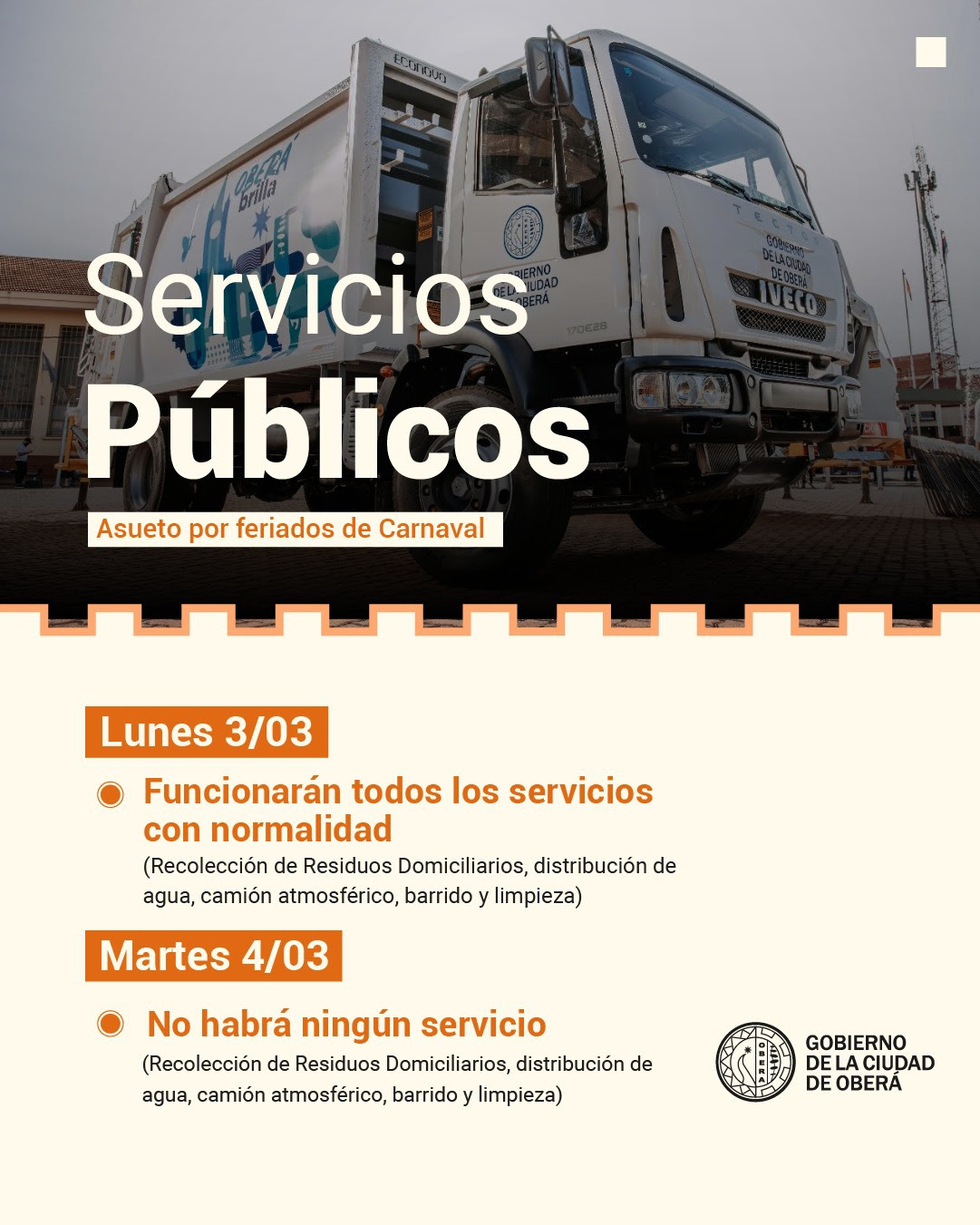 El lunes tres y martes cuatro de marzo es feriado de carnaval, por tal motivo los servicios de recolección, agua, atmosférico y barrido funcionarán normalmente el primer día de la semana, mientras que el martes no habrá ningún servicio.