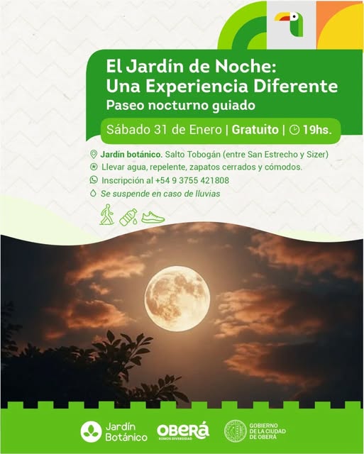 En el Jardín Botánico se vivirá una nueva edición del Paseo Nocturno, una actividad que ya se volvió un clásico de la temporada 2026. En este punto, se destaca el trabajo de la Dirección de Turismo, Recreación y Cultura del Gobierno de la Ciudad de Oberá, que ofreció con éxito esta propuesta todos los sábados de enero y que este 31 volverá a abrir las puertas del Jardín Botánico para una experiencia inmersiva única.
