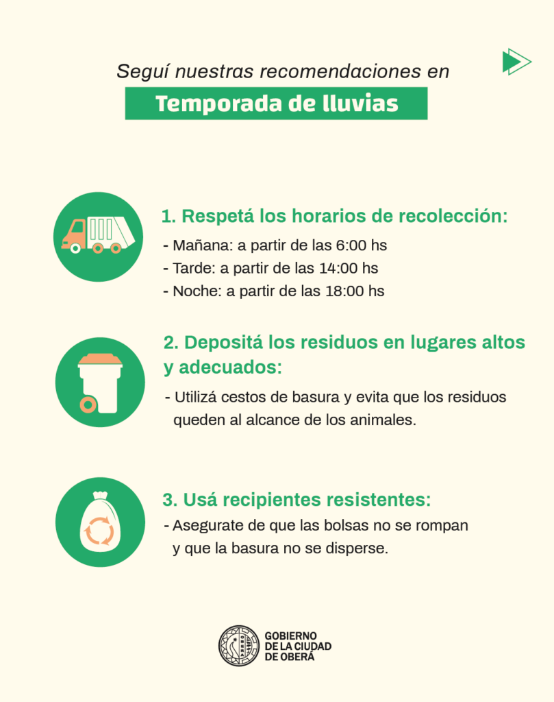 Desde el Municipio se solicita respetar los horarios de recolección de residuos, que se realizan por la mañana a partir de las 6:00 horas, por la tarde desde las 14:00 horas y por la noche a partir de las 18:00 horas. Depositar la basura en los cestos domiciliarios en los horarios correspondientes evita que los residuos permanezcan en la vía pública y sean arrastrados por el agua.