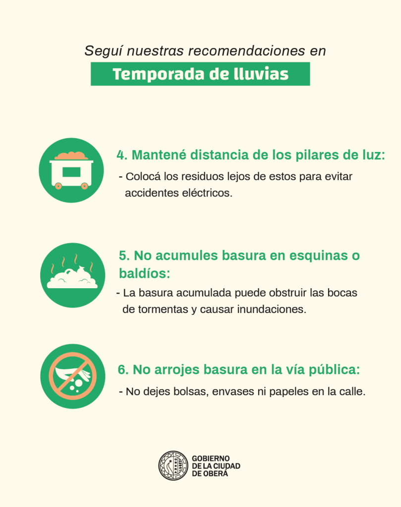 Con el objetivo de prevenir inundaciones y mantener las calles limpias y seguras, el Gobierno de la Ciudad de Oberá recuerda a los vecinos la importancia de seguir una serie de recomendaciones durante la temporada de lluvias.