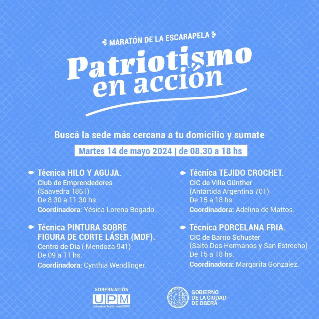 El Gobierno de la Ciudad de Oberá se suma a la iniciativa de la Universidad Popular de Misiones UPM, en este evento a nivel provincial que invita a crear un punto de encuentro en los diferentes municipios. El objetivo es que, mediante diferentes técnicas originales, poder fabricar varios tipos de escarapelas diferentes que posteriormente serán repartidas a la comunidad en general. La actividad se dará este martes 14 de mayo de 8.30 a 18hs.