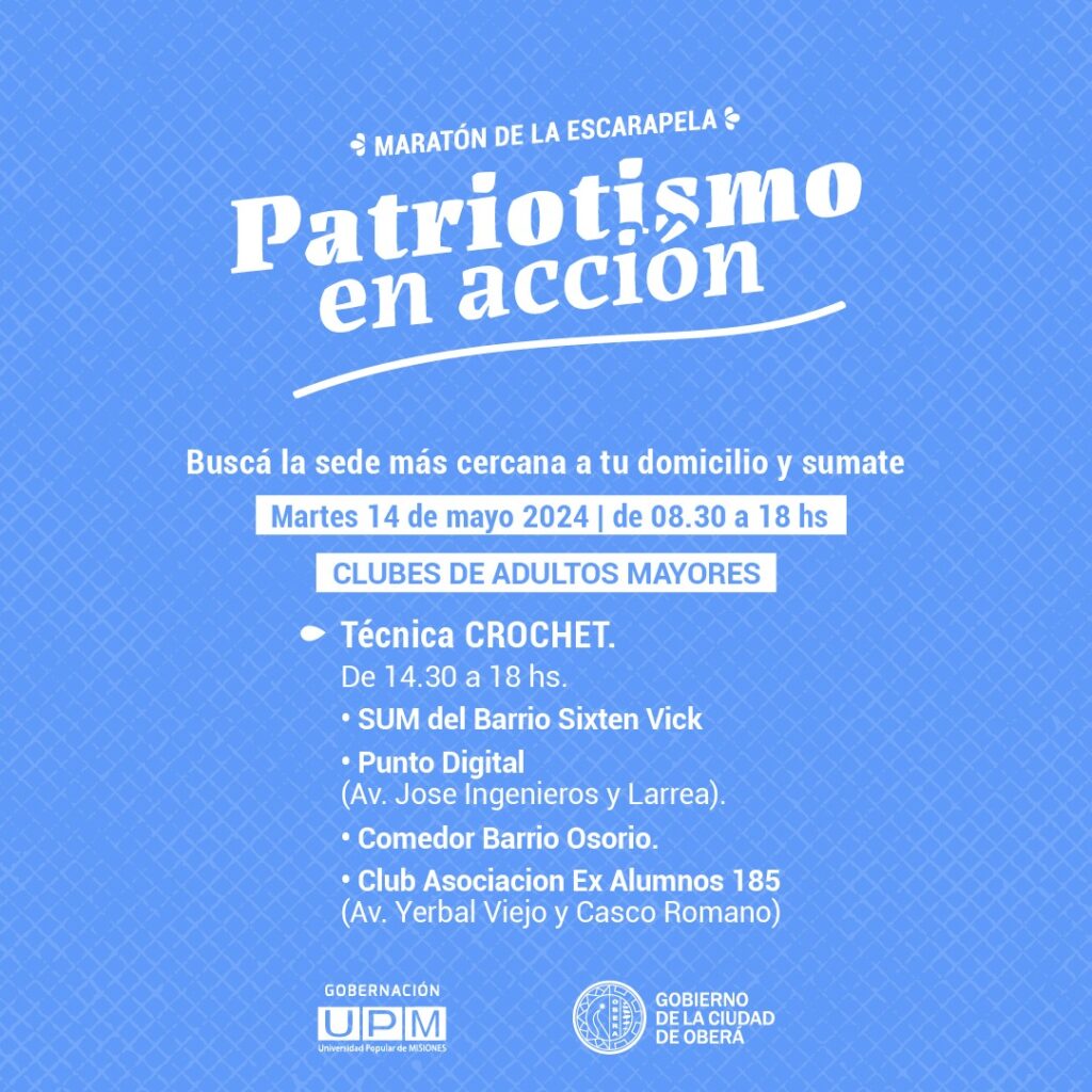 El Gobierno de la Ciudad de Oberá invita a toda la comunidad a sumarse al Maratón de Confección de Escarapelas “Patriotismo en Acción”. La actividad es libre, gratuita y para toda la familia.