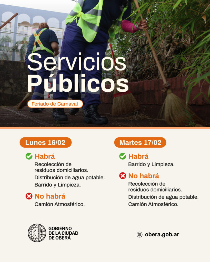 El Gobierno de la Ciudad de Oberá informa a la comunidad el cronograma de servicios previsto para el feriado de Carnaval.