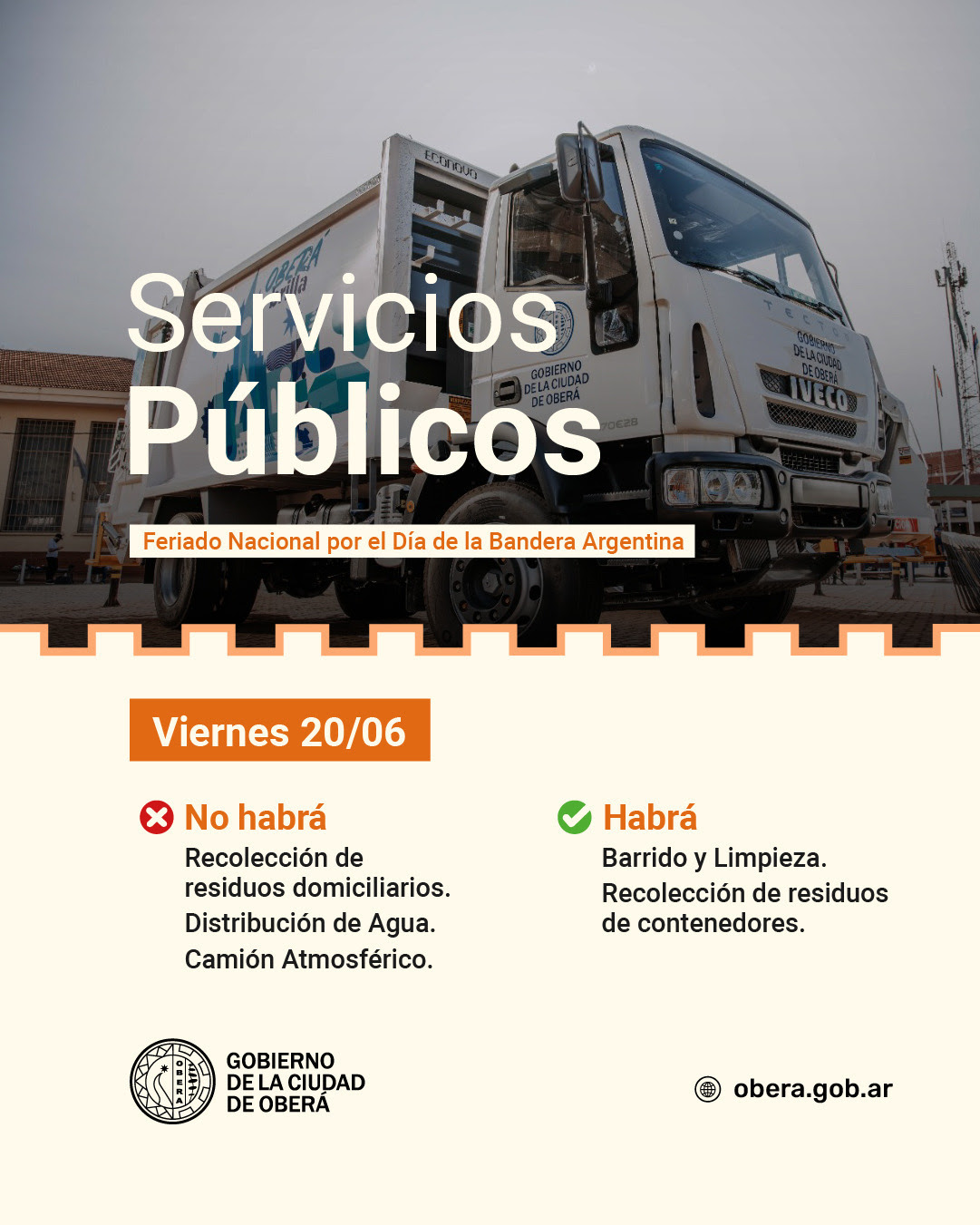 El próximo viernes 20 de junio es feriado nacional por ser el día de la bandera Argentina. Por tal motivo no habrá servicio de recolección de residuos; tampoco distribución de agua potable y camión atmosférico.