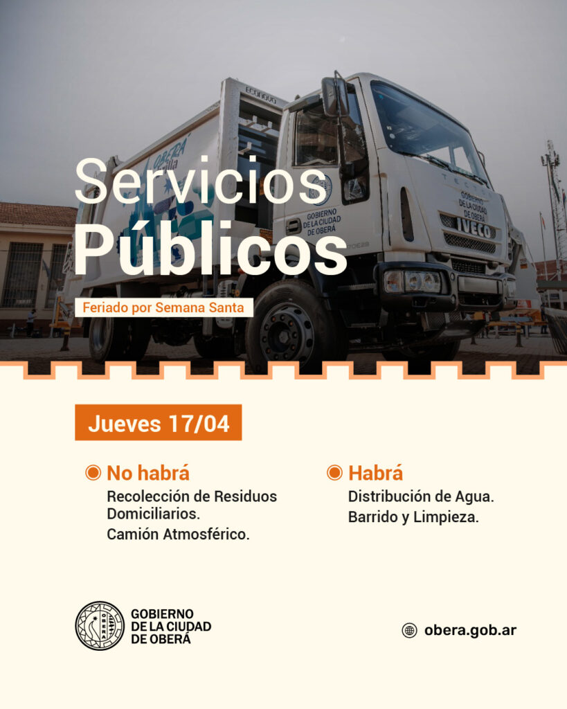 Desde el Gobierno de la Ciudad, a través de la Secretaría de finanzas, infraestructura y servicios públicos, en conjunto con la Dirección de servicios públicos y ambiente informan a la comunidad como serán los servicios durante los días feriado de Semana Santa.