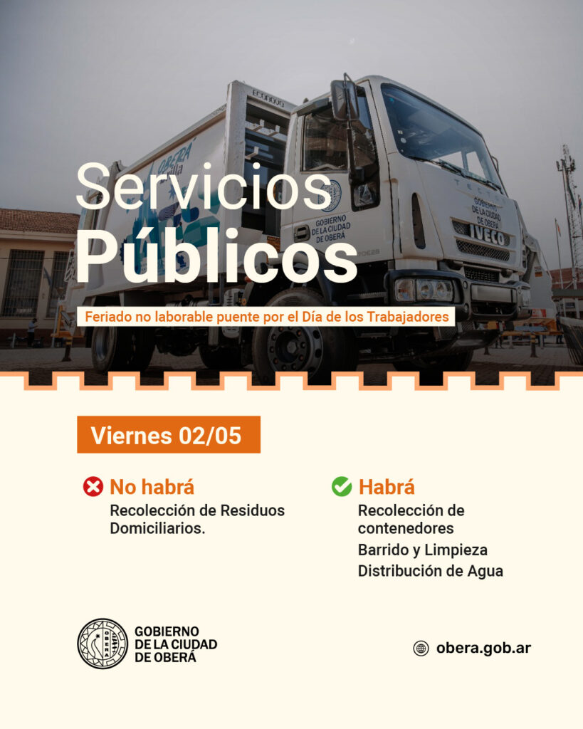 Desde el Gobierno de la Ciudad de Oberá, informan que el viernes, feriado puente, no habrá recolección de residuos domiciliarios y si se realizará recolección de contenedores, barrido y limpieza, además distribución de agua.